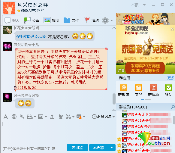 在“风采依然总群”内,中国青年网记者看到,成员共有268人。男性群成员被称为“土豪帅哥”,按照贡献大小分为情郎、护法、护花、护群、名誉副主、名誉正主、风采亲王7个等级。群主制定了一套升级规则,方式是在群内发红包,男性群成员只能抢自己发的红包,抢错了必须发出来,否则会被移出群。女性群成员提供色情聊天服务,可以抢所有的红包。