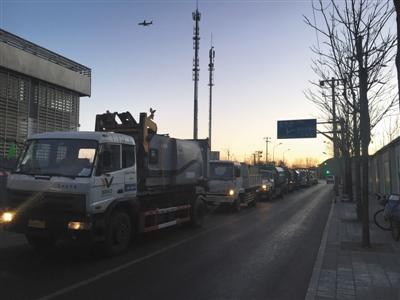 7时40分,从焚烧厂入口处一直到金榆路口的红绿灯处,停靠112辆标着“朝阳环卫”的垃圾运送车,排队超2公里。远处还有几辆环卫车开来。