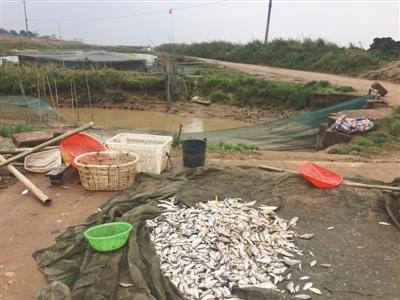 2016年12月15日,鄱阳湖正在枯水期内。湖面雾蒙蒙的,湖滩裸露着,一些越冬候鸟停在周边农民的藕田里寻找食物。水位下降时,一些来不及逃跑的鱼儿被渔民“斩秋湖”,个头不大,堆在岸边。