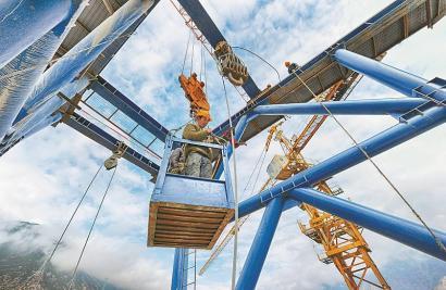 工人们在桥塔顶部调运设备。