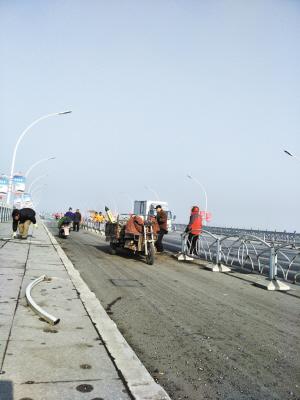 昨日13时30分,子龙大桥的交通已通畅无阻,除一辆出租车外,其余事故车辆都已被拖离现场。由北向南方向的桥面上,散落着不少车辆相撞掉落的残骸碎片和隔离护栏。正定环卫大队的十几名环卫工人正紧张地进行清扫工作。沿子龙大桥由北向南走,记者发现,桥上用来隔离机动车与非机动车的隔离护栏出现了多处缺口,最长的一段缺口长达十几米,一些没有被撞掉的栏杆也出现不同程度的损坏。车辆残骸和损坏的护栏散落在桥面上约200米长。快车道和慢车道上,可以看到大片的盐粒。“上午不少车在这儿相撞,我们已经清理一会儿了。”一位环卫工人说。