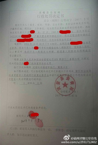 通报指出,当事女子系沈某某(女,27岁,灵璧县朝阳镇人)。2017年1月3日,沈某某到公安机关投案自首,对其违法行为供认不讳。目前,警方依法对其作出行政拘留4日的处罚。