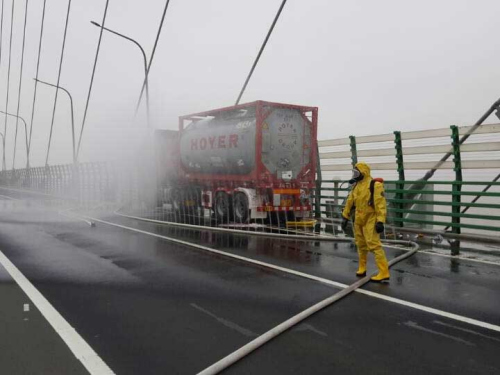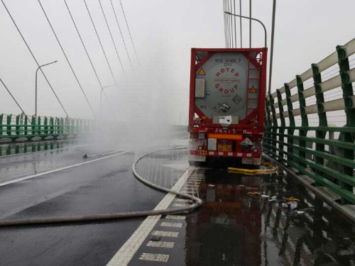事发后,大桥高速交警立刻对上海、宁波两个方向全部实行封闭,同时桥上1391K-1396K封路。消防上午9时赶到现场,排查泄漏点,将泄漏点堵住。然后利用水罐车水带的稀释作用,喷水将泄漏气体稀释。