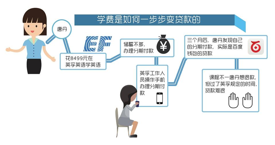 唐丹告诉记者,交报名费的时候因为刚毕业,身上没有太多积蓄,因此选择了分期付款的方式。“英孚英语的课程顾问用他的手机帮我办理了百度钱包的分期付款。当时我以为只是通过百度钱包把钱分期交到英孚英语。”唐丹告诉记者,后来一次偶然的机会,她才发现原来这是一笔贷款。“他们当时在我不知情的情况下办理贷款。我觉得他们是在欺骗我。”