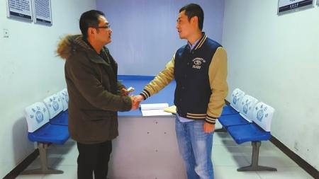 失主郑先生(左)认领自己丢失的钱。