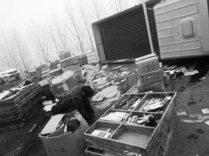 货车侧翻年货撒一地 三九天18人踏冰救援(图)