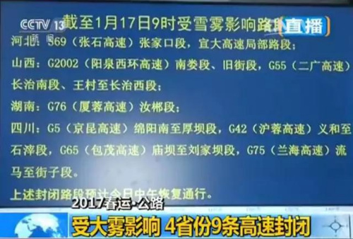 受大雾和降雪的影响,截至今天上午9点,全国4省市9条高速路段封闭。包括河北张石公路张家口段、宣大高速局部路段;山西阳泉西环高速南娄段、旧街段,二广高速长治南段;湖南蓉厦高速汝郴段;四川京昆高速、沪蓉高速、包茂高速、兰海高速的部分路段。