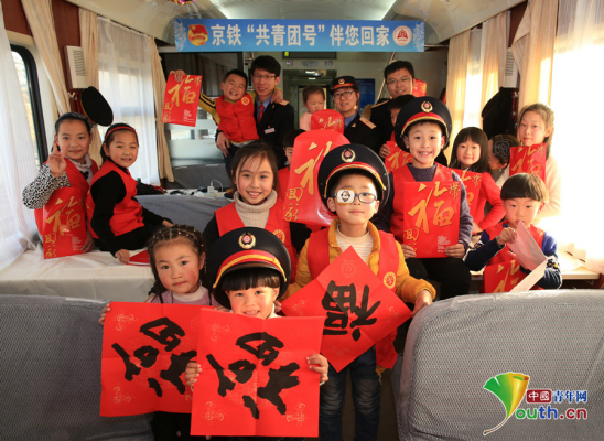 “共青团号”乘务员为小旅客送“福”字。北京铁路局团委供图