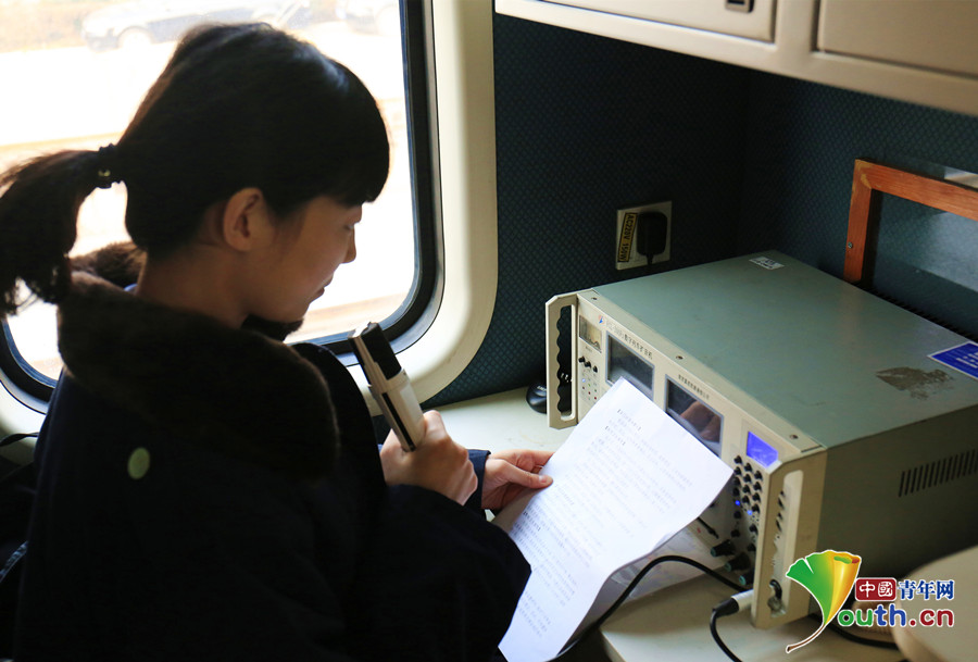 “共青团号”列车员查验旅客车票。北京铁路局团委供图
