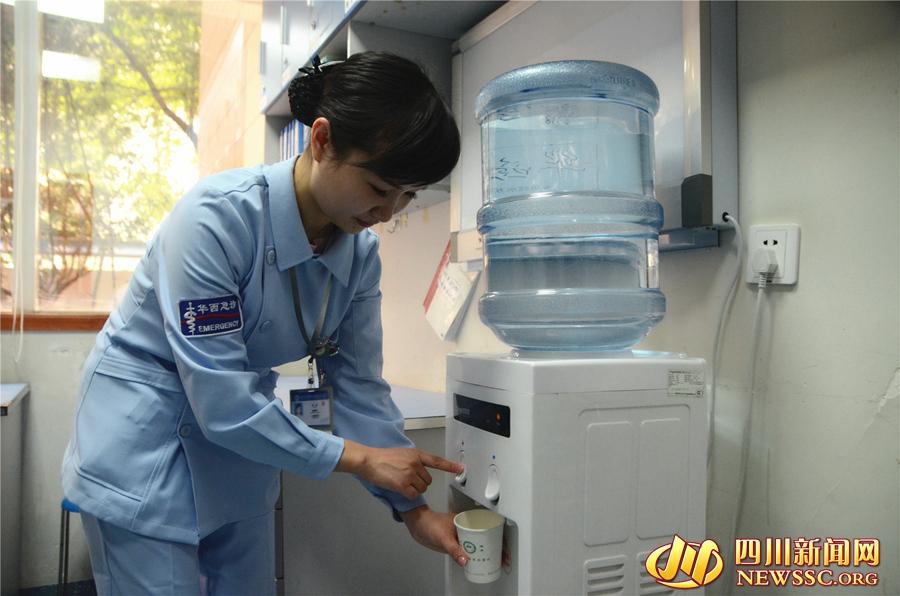 工作间歇,梁燕在休息室接水喝。她告诉四川新闻网记者,在春节期间,忙起来,连喝水的时间都没有。
