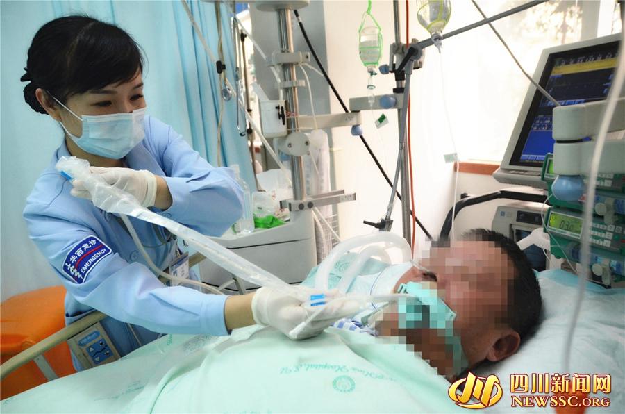 四川新闻网成都1月31日讯(记者 刘佩佩 摄影报道)“爷爷,有点儿难受,你坚持一下,很快就结束了。”临近鸡年除夕的一天下午,在川大华西医院急诊重症监护室里,护理组长梁燕正在为一名84岁重病老人清除气道痰液。躺在床上的老人闭着眼睛,带着呼吸机,不能说话,意识也有些不清,但从老人的身体反应,梁燕知道吸痰让老人感到难受,所以她细心安慰着老人。而在急诊重症监护室,有近90%的病人都有意识障碍,这为护士的工作带来困难。