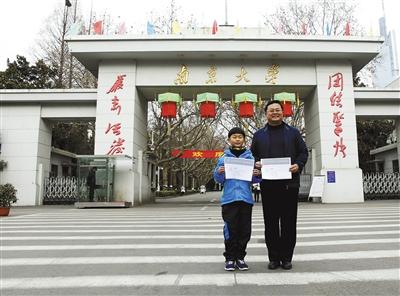 2月6日,何宜德和父亲来到南京大学继续教育学院报名自考,之后和父亲在校门口合影。