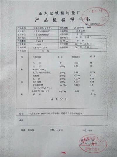 被查扣的盐企提供的产品检验报告书,检验结果为“符合标准要求。”受访者供图
