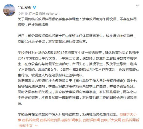 近日,部分网媒报道临沂第十四中学班主任体罚猥亵学生。该校得知此信息后即对涉事教师进行停课调查。临沂市兰山区委对外宣传办公室今日在其官方微博公布了临沂第十四中学对该事件的调查结果。