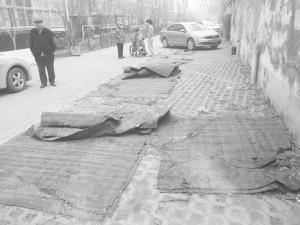 在现场,记者发现刘先生居住的华阳小区3号楼前,地上散落着大大小小十几块油毡。据居民介绍,这些油毡都是双层的,中间沾着厚厚的沥青,掉落的这些油毡中最重的超过50公斤,最小块的也得四五公斤重。“这个大块的是三四个小伙子抬过来的。”刘先生指着地上一块面积较大的油毡无奈地说。随后,刘先生又指了指楼顶,说,你看那儿,很快就会掉下来的。记者发现,房檐上确有一大块油毡探出“头”来,非常危险。