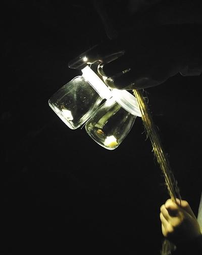 李平介绍,现场至少有几千只萤火虫,被装在玻璃瓶中,每瓶约有三只萤火虫成虫。为了让萤火虫发光,工作人员不断摇晃玻璃瓶,瓶内的虫子就会在瓶内四处乱撞之后发光。“全场随后就会响起一阵阵赞叹声。”