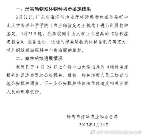 中新网4月24日电 今日,珠海市海洋农渔和水务局官方微博通报查处“网民举报贩卖海豚”事件进展情况:经中山大学海洋科学学院(农业部指定专业机构)鉴定,送检的涉案动物残体样品肌肉确定为“哺乳纲鲸目海豚科中华白海豚的组织”。