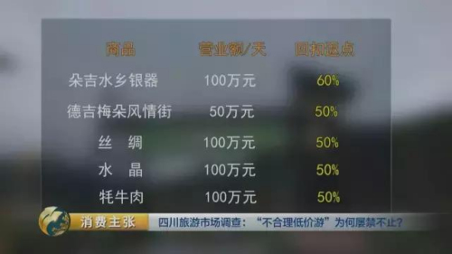 2016年11月,央视财经《消费主张》栏目报道了四川省旅游乱象,在四川一些景区,旅行社和购物商店勾结,旅游购物回扣现象非常普遍,银器回扣高达60%,其他水晶、丝绸、牦牛肉的回扣也高达50%。