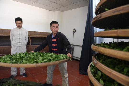 在福建省安溪县祥华乡旧寨村,茶农在检查晾青的鲜叶 张九强 摄