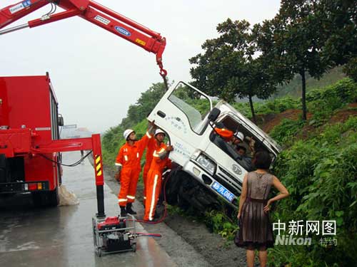 当消防车碰到第十四辆翻倒车辆时,该车驾驶员被压杂驾驶室,一旁的妻子已经泪流满面,消防队员们利用随车吊机很快就把受困司机给解救出来。