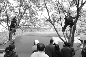 中午12时许,女儿和施救者们一直苦劝,树上的母亲还是不肯动,精神显得有些恍惚。