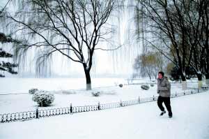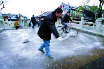 今天早晨,当第一场雪花零星光顾京城时,在银锭桥上,管理人员开始撒融雪剂,防止行人滑倒。张玉军 摄