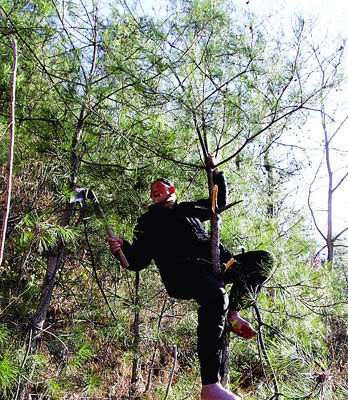 12月5日,记者在后山上找到了正在修剪松树枝的王生金。他赤着双脚,站在一棵刚刚修剪完的松树的半腰上,修剪旁边的树枝。见有人来了,老人利索地溜下树,而且光脚也不怕刺扎。王生金老人时常都是打着光脚,被周围群众冠以赤脚“山神”的雅称。老人却幽默地说:“光脚走路比较利索!”原来,老人年轻时,在山里种树修剪,一双新鞋穿不了几天就磨烂了,由于家里穷,从那时起,他就不穿鞋了,光脚已成了习惯。常年在林区巡山,老人随身三件宝——“镰刀、䦆头和水壶”,䦆头用来挖地、栽种树苗,镰刀砍除杂草,也可修剪树枝,水壶用来盛泉水喝。在大山里,一口泉水,两块窝头便是一顿饭。