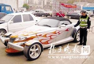 “当了这么多年交警,还真没见过这样的车!”在现场,执勤交警惊奇不已。细看之下,该车车头两侧伸着两个手柄状的东西,前车轮凸出在外部,银灰色的车身上,布满了橘红色的火焰纹,从正前方看,很像三轮车。但转到侧面,就能清晰地看出了一辆顶级跑车的轮廓,底盘很低,轮胎很宽,上方为软顶敞篷。来到车后部,交警一番对比后,这才确认悬挂的外文车牌实际上是美国加州的号牌。据驾车人钱先生介绍,这是辆克莱斯勒“猎兽”限量版顶级跑车,身价300万元,目前大陆地区仅有几辆,不过这不是新车,而是他从美国购置的二手车,目前相关手续已经齐备,正准备选个日子去车管所换牌。