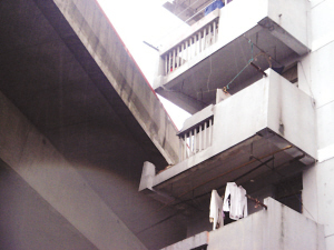 记者随后在苏安新村内找到了这幢编号157幢的居民楼,站在楼下,记者有了更惊奇的发现:与高架桥“亲密接触”的是居民楼五楼一住户的阳台,而在它的下面,四楼住户的阳台则因为高架桥路面的穿过而不得不砸掉了一半,从高架桥上也可轻而易举地跳到四楼阳台上。