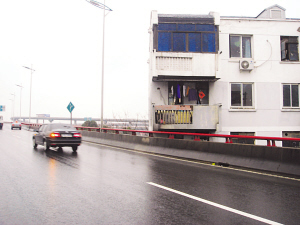 昨天中午,记者乘坐一辆出租车前往官渎里立交桥,当司机得知我们要寻找一处紧挨着居民楼阳台的高架桥时,他肯定地告诉记者那是苏安新村内的一幢居民楼,因为他们开车从东环路进入官渎里立交桥时常要路过那里的,经常开车的司机应该都有印象。记者喜出望外,出租车司机带着我们很快就来到了“苏州最牛高架桥”的准确位置,这是一段东环路由南往北方向进入官渎里立交桥的匝道,记者下车一看,的确与网友照片中的情况一模一样:一座居民楼阳台水泥底座紧靠高架桥的红色栏杆,从高架桥可轻而易举地爬到阳台上,阳台上晾晒的衣物也随时可被风吹到高架桥上。