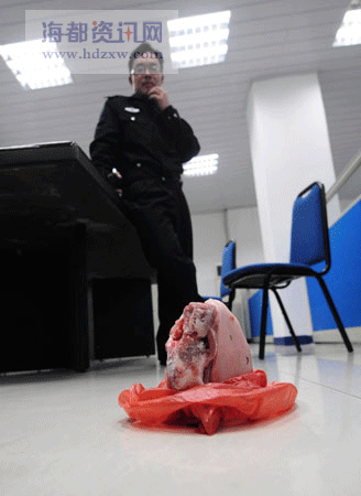 在象园派出所内,记者见到了这块“肇事”猪肉,只见这块冻肉是带骨的,凹凸不平的骨头露在肉外面。警方说,由于目前没能找到目击者,他们将继续对56号楼进行排查,看看到底是谁家掉落了冻肉。(吴臻 王浩志 邱道岑)