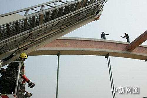 4月9日13时50分许,一位年轻女子再度因感情问题爬上了诸暨市浦阳江上的茅渚埠桥的3米高弧顶,站在上面坐立不安。为了不让站在弧顶上面的女子因体力不支坠落,消防官兵把救生气垫铺在茅渚埠桥上,公安部门联系的快艇也及时赶到,在江面上待命救援。消防登高车慢慢升起,轻生女子的弟弟跟随消防官兵乘坐登高车准备上去劝说,但该女子情绪极为激动,根本不让救援人员接近,并要求救援人员撤离现场。