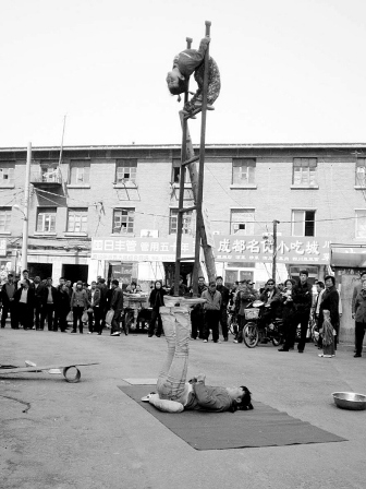 围观的人不少,给钱的也不少,都是看这帮孩子太小太可怜了。“这帮孩子我半个月前就看到过,是河南周口的,在公园、商业街、北市场等热闹地方卖艺,表演的全是危险动作,啥保护措施都没有。一共六七个人,有两三个大人,其余全是小孩。大人不露面,小孩表演警察都撵不走。”正议论间,3岁的“台柱子”上了场,小女孩连路都走不稳。“姐姐”躺在地上当底座,双脚蹬着一架高约3米的铁梯子。小女孩顺着铁梯一点点向上爬,姐姐一边敲着铙钹造气氛,一边冲她喊:“上到顶,倒立——”“姐,俺害怕——”小女孩带着哭腔求“姐姐”,可是在“姐姐”的大声呵斥下,小女孩只能继续做动作。