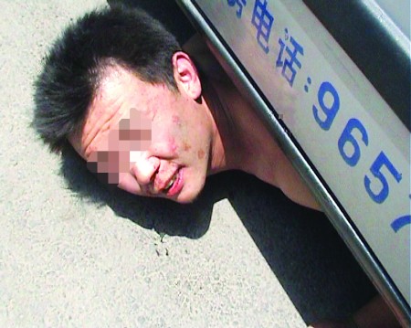 上午11点左右,经七纬十二路口有许多人围观。一名男子赤裸着上身趴在出租车底下,脸上有些许血迹。记者一打听才得知,原来,这个小伙乘坐出租车到这个路口,突然提出要换车,而且不付车费。