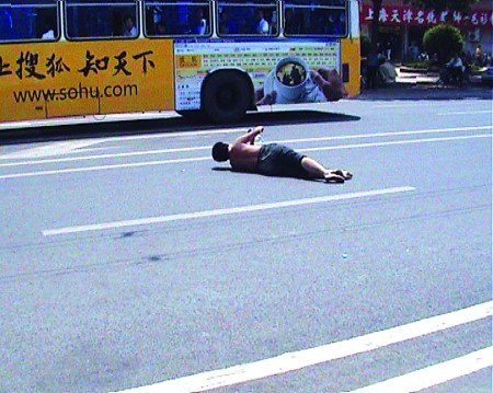 事情还远远没有结束。小伙被抬出后,躺在地上先是一动不动,后来又打起滚来,一直滚到了机动车道上,险象环生(图②)。最后,又是几位热心市民将他抬到了旁边的树阴下。