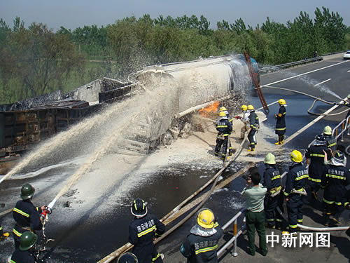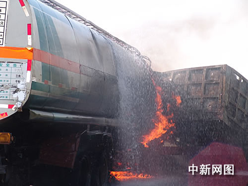 中新网连云港5月13日电(孙翔鸣 连消)五月十三日早上六时许,汾灌高速公路赣榆至新浦方向约五十公里处,一辆装有二十一吨九十号汽油的槽罐车与一辆大卡车发生追尾事故,造成槽罐车驾驶员及副驾驶员死亡,槽罐内汽油受到撞击后泄漏并起火。