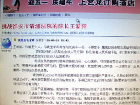 在西祠胡同网站上,记者找到曹先生5月19日发表的题为《挑战淮安市清浦法院的院长王新阳》的帖子,帖子称他花一万多元打官司,最后却只得到800元赔偿。看完整篇帖子后,记者在为他的遭遇表示同情的同时也发现,该帖子情绪激愤 并有多处攻击性语言,在帖子的结尾他将自己定性为挑战人,而且留下自己的真实电话号码。记者昨天根据法院判决书及对曹先生本人的采访,了解了整个事件大致的来龙去脉:
