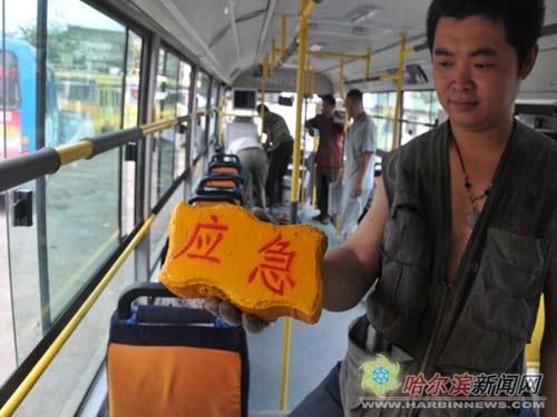 为方便乘客从遇到突发事件的公交车辆里逃生,哈尔滨市公共电车总公司从昨天开始在115路公交车的车厢内试行放置“应急砖”。