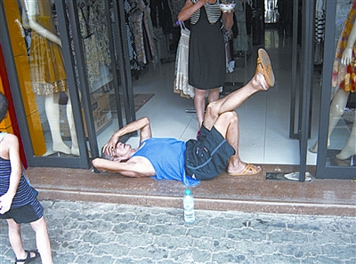 昨日上午7时许,一对老夫妻来到位于汉阳大道489号的一服装店门口。老太搬来一张躺床,“悠然地坐在店门口”,老汉则坐在门口台阶上。服装店开门之后,两位老人将店员“放进去”之后,就不让顾客进门。店员上前劝解,老汉干脆躺在门口地板上“装睡”,引来顾客侧目(见图)。