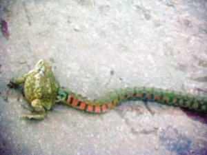 一条近3米长的大蛇,咬住一只癞蛤蟆并强行果腹!癞蛤蟆为逃生施展“蛤蟆功”拼死“抵抗”。自然界食物链上血腥竞争的“恐怖”一幕,5日上午11时在镇江新区港务公司附近的草丛和人行道上上演。江苏省交通技师学院的王凯同学和其师傅恰巧目睹,并用手机拍摄了这一精彩的“蛇吞蛤蟆”场面。通过视频可以发现,这场生死搏命持续了12分钟之久。