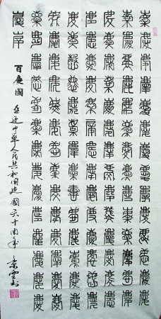 在傅老家中采访时,他把刚刚作就的一幅“百庆图”展示给记者,“今年是建国60周年,这也是举国上下的大喜事,我用了一个月的时间作成了这幅‘百庆图’,通过庆字表达我对祖国大庆的喜悦心情。”