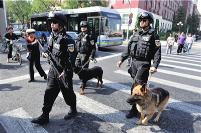 昨天上午,3名头戴防暴头盔,身配18.4毫米防暴枪、95式冲锋枪和92式手枪,带领两只警犬巡逻的特警队员现身台基厂北口。昨天起,武装特警开始带警犬在长安街沿线、西单、王府井等重点地区巡逻。据悉,多个特警巡逻车组从早8点半到晚10点无缝隙地进行巡逻,每个车组由3名特警队员组成,参加巡逻的还包括部分女特警队员。警方提醒市民,由于特警携带的大多是扑咬犬,看到警犬后千万不要试图抚摸、引逗警犬。(董世彪 卢国强)
