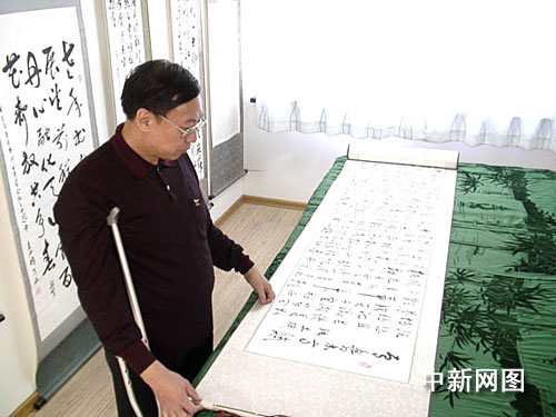 中新网乌鲁木齐9月24日电(王小军)新疆乌鲁木齐一残疾人身残志坚,闲暇之余,拿起手中的画笔,书写下一幅13米长卷,献给新中国成立六十周年。
