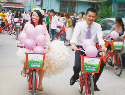 昨天,一支飞扬着彩色气球的公共自行车队,在西湖文化广场集结。新郎麦田与新娘小A骑公共自行车步入婚姻殿堂。