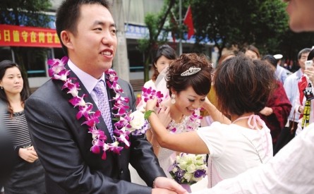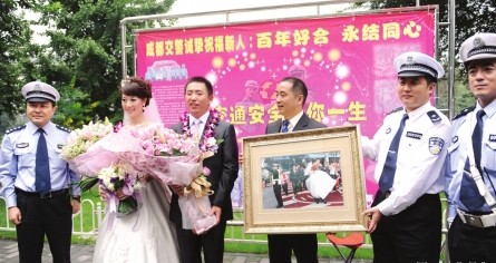 曾经为无数新人保驾护航的合江亭交警韩韬昨日(26日)大婚,众多新婚夫妇赶来祝福