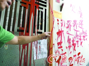 这几天,家住广州较场西路的梁伯有点烦。他儿子欠了人家钱,追债公司却找到他家来骚扰,昨天中午他家的大门被追债公司的人用红油漆刷了“还钱、还债”的字样,楼道里贴满了标语,还撒了冥纸。