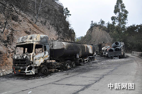中新网南宁十二月十四日电 (王刚 梁铭秀)十四日凌晨,广西贺州市境内发生三车相撞事故,一辆汽油槽罐车遭追尾后汽油发生泄漏并引发大火,造成追尾车辆上三人被活活烧死。