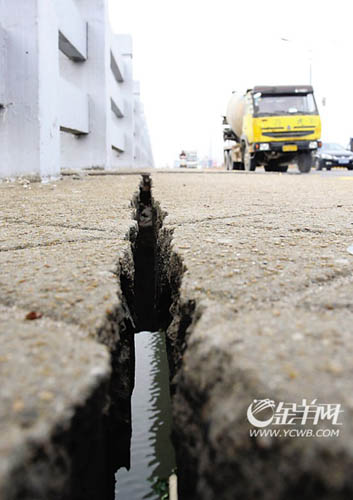 记者站在双向六车道的桂江大桥上,乍一看还看不出桥梁有什么问题,但沿着北往南方向的人行道走,便可发现大大小小的裂缝遍布人行道桥面,最细小的裂缝甚至由桥北延伸到桥南,记者用防盗门钥匙都可以塞进这些小裂缝。在一根编号为“D43006”的路灯对出的人行道,记者看到了裂缝中最宽的一道,这裂缝长约三米,宽3到10厘米,一只鞋子完全塞得进去。透过这条裂缝,可以看到桥下流动的江水(右图)。
