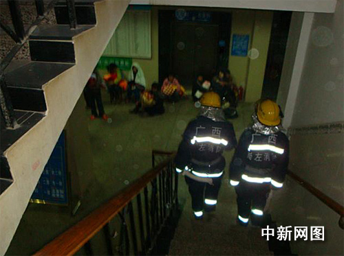 当日凌晨,天等消防大队接到报警后立即出动两辆消防车和9名官兵火速前往现场。到达现场后,发现人民医院住院部楼层一片漆黑,通过和医院方简单了解后,指挥员立即命令侦察员对起火点和火情进行侦察。