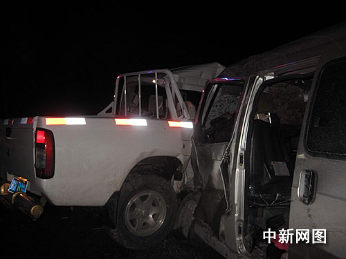 中新网贵港1月11日电 (杨文福 黄杰雄 王刚)1月10日晚,广西贵港市桂平境内发生一起恶性交通事故,一辆皮卡车和一辆面包车迎面相撞,造成一妇女和一小孩当场死亡,另外有4名人员受伤被困.